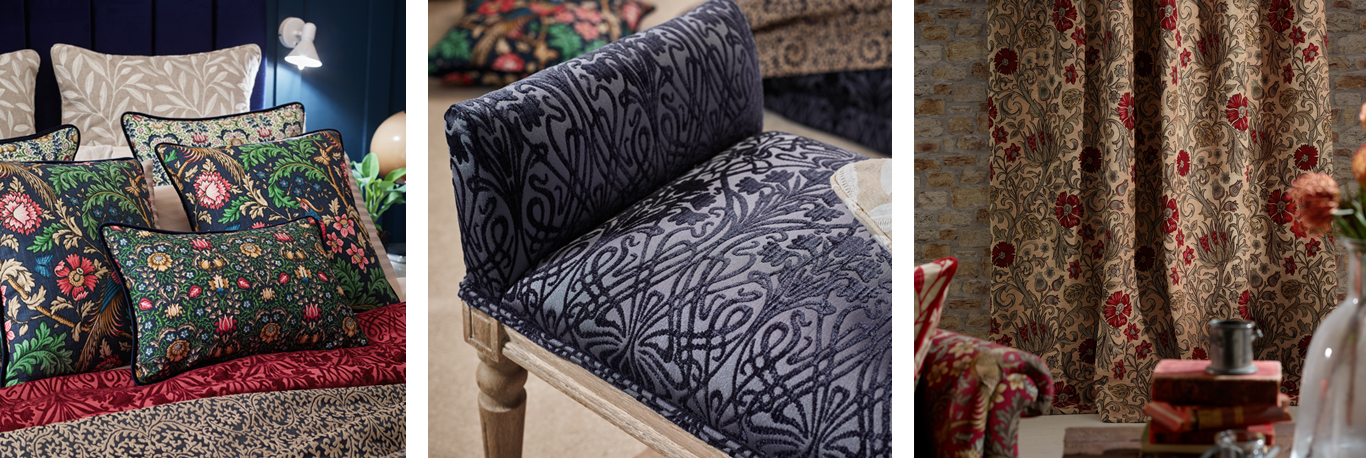 Bold patterns and hues inspired by the outdoors. Patterns and designs borrow from the arts and crafts and art deco styles. Sumptuous fabrics in vibrant colours and including tactile raised chenille designs.
