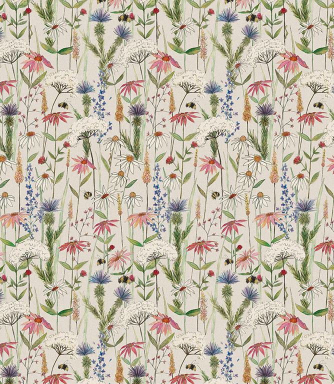 Inspired by glorious wildflowers, this cotton-linen blend fabric has a design of playful bumble bees flying amongst flowers such as cornflowers, dandelions and cowslips.