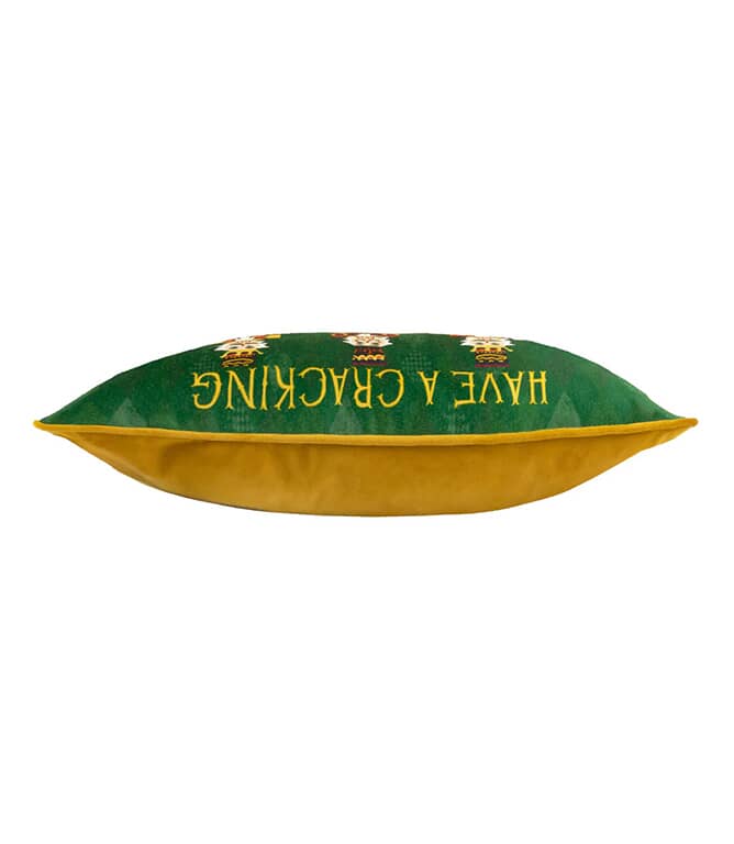 A novelty Christmas cushion featuring three nutcracker soldiers and a playful festive message on a rich emerald background with gold velvet reverse.