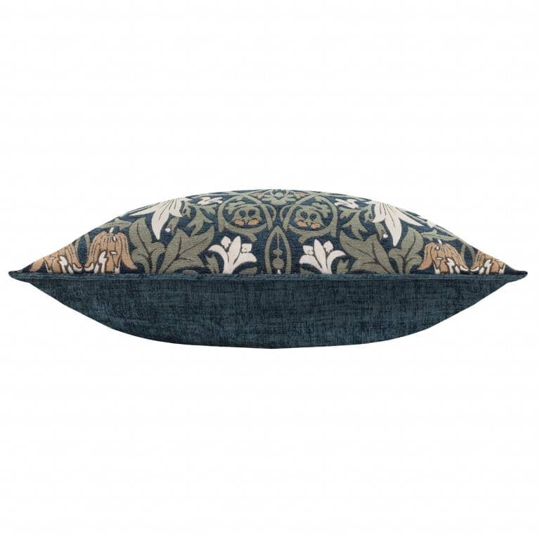 Bring a luxurious touch into rooms with this William Morris cushion which features a dramatic flame-like motif and spiky clusters of foliage with delicate scrolling tendrils, inspired by beautiful fritillary blooms. This cushion has a plain chenille reverse, matching piping detail, and feather inner.