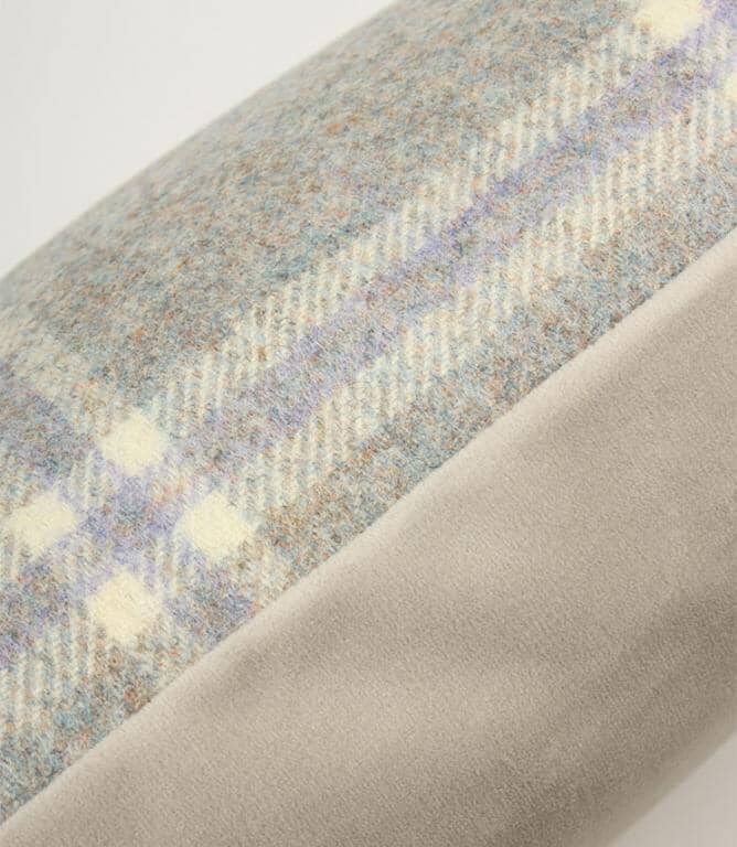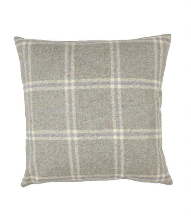 This cushion has a 100% wool check by Abraham Moon on the front and a soft polyester back, in tones of mauve, light grey and cream.
