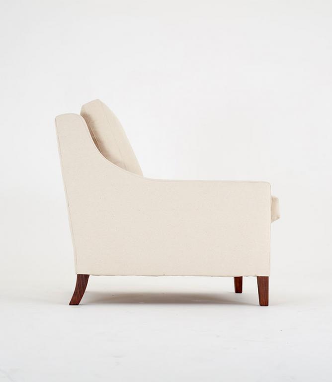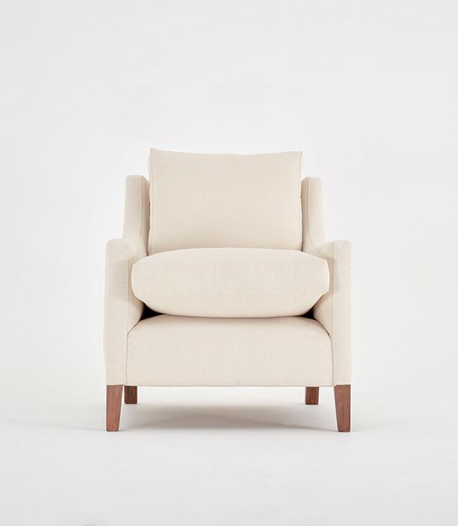 This beautiful armchair has been handcrafted in Gloucestershire and has a relaxed look with sloping arms. Choose from any of our fabrics and from pattern books in the showrooms to create your own unique chair.