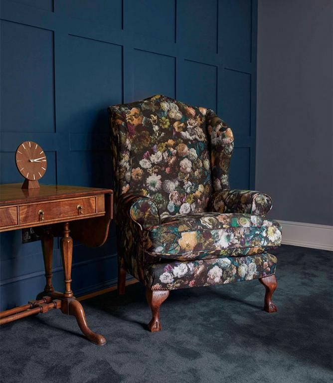 This beautiful armchair has been handcrafted in Gloucestershire and has a traditional high back wing chair style and studded detail. Choose from any of our fabrics and from pattern books in the showrooms to create your own bespoke piece to suit your home.