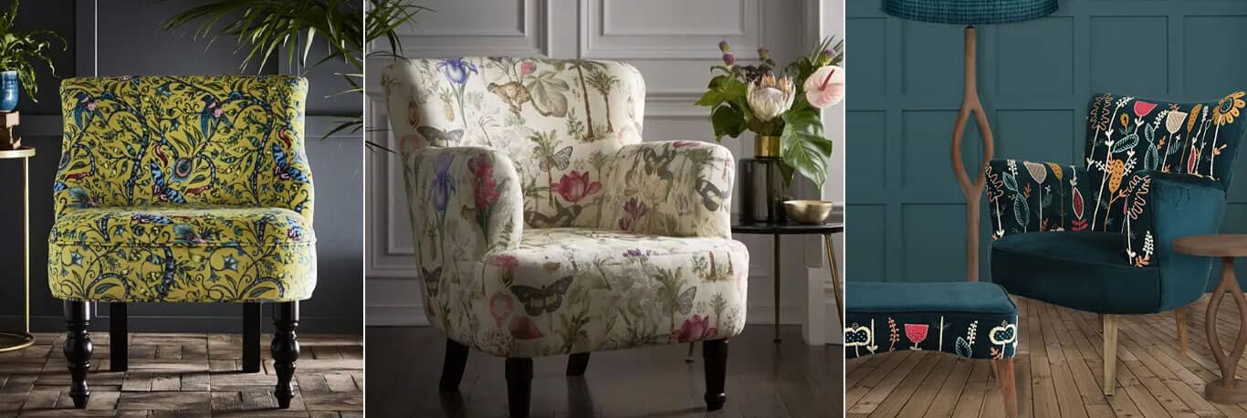 Our statement chairs feature exuberant vibrant designs from Clarke and Clarke's ranges with Emma J Shipley and Oasis Home and the beautifully decorative Botanical Garden Collection.