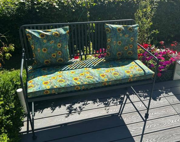 Our customer Sarah has transformed her outdoor bench with our vibrant Field Blooms fabric, creating matching seat and cushion covers that bring the joy of summer to her garden. The lively sunflower print looks stunning in the sunshine and pairs beautifully with the surrounding blooms for a truly uplifting outdoor space.
