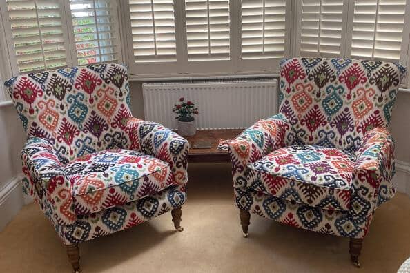 Dawn has given these armchairs a bold new look using our vibrant Salma fabric. The bold ikat pattern and mix of rich colours bring such life and warmth to the room, making these chairs real statement pieces. A perfect example of how the right fabric can totally reinvent a classic shape!