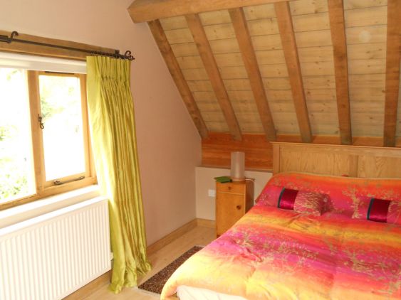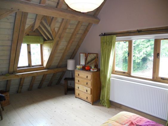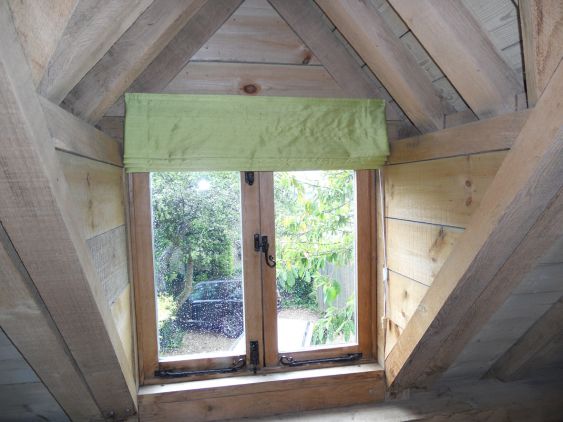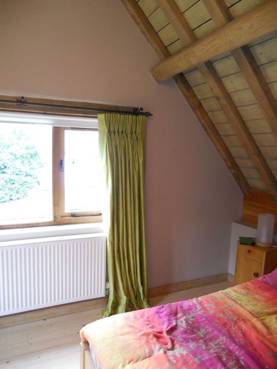 Full length curtains and a roman blind were made in a striking green fabric for this client's cottage bedroom. Roman blinds are an ideal window treatment for a dormer window.