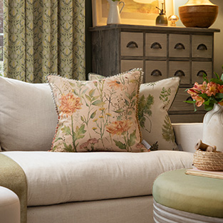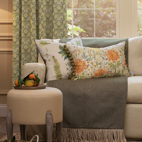 Inspired by the soft tones of wildflowers and meadows, Hedgerow is another best-seller that blends beautifully into modern cottage or vintage-inspired interiors. Its subtle watercolour florals in gentle mauves, pinks and greens are set against a warm neutral ground, creating a light and airy feel. This cotton-linen blend is ideal for full-length curtains and decorative scatter cushions, and looks stunning when layered with soft plains or textured weaves for a lived-in, layered look.
