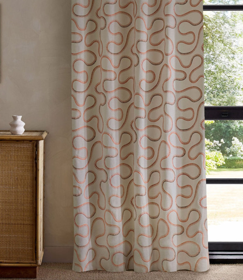 Woven from a cotton-rich blend, it balances softness with structure, making it wonderfully versatile. As curtains, the embroidered lines drift effortlessly down the fabric, creating rhythm and subtle drama. Roman blinds feel tailored yet playful, while cushions allow the stitchwork to take centre stage, especially when finished with a simple piped edge.