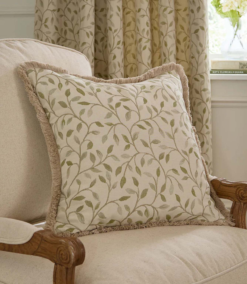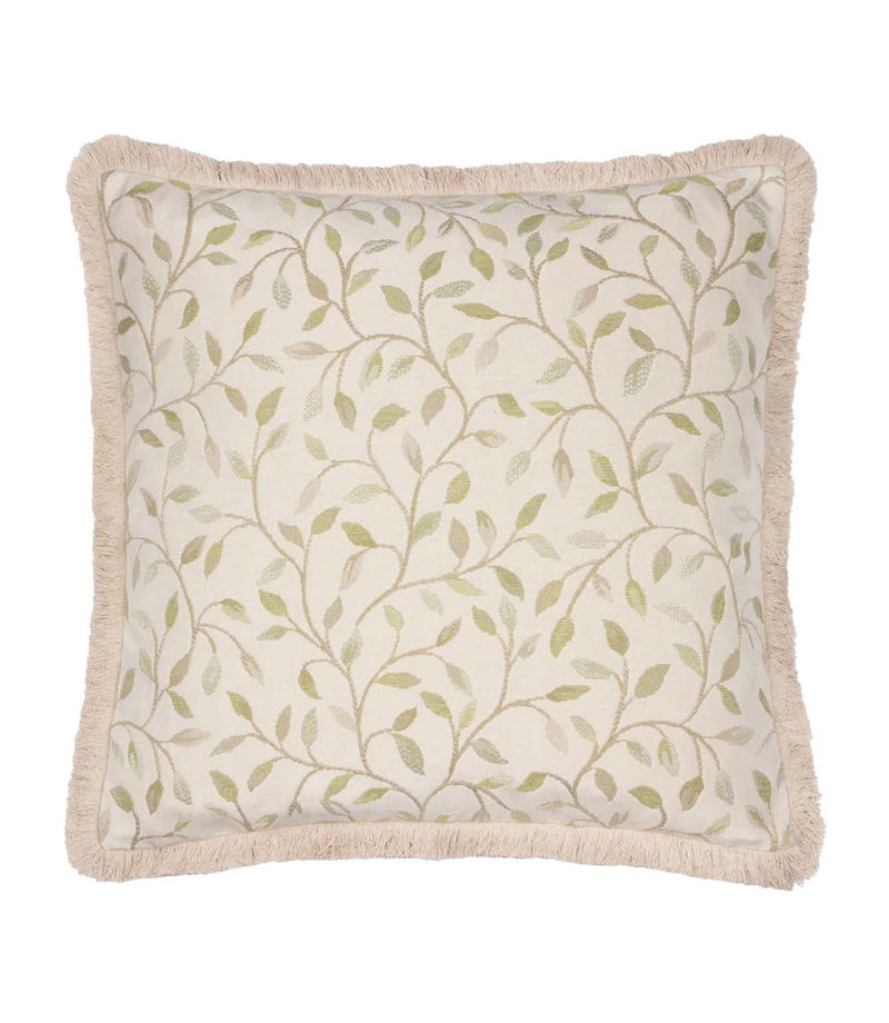 The Cervino Lichen Fringed Jacquard Cushion by Voyage Maison brings a refined touch of pattern and texture to any interior. Woven with a delicate trailing leaf motif and finished with a soft fringed edge, this cushion pairs classic detailing with relaxed elegance.