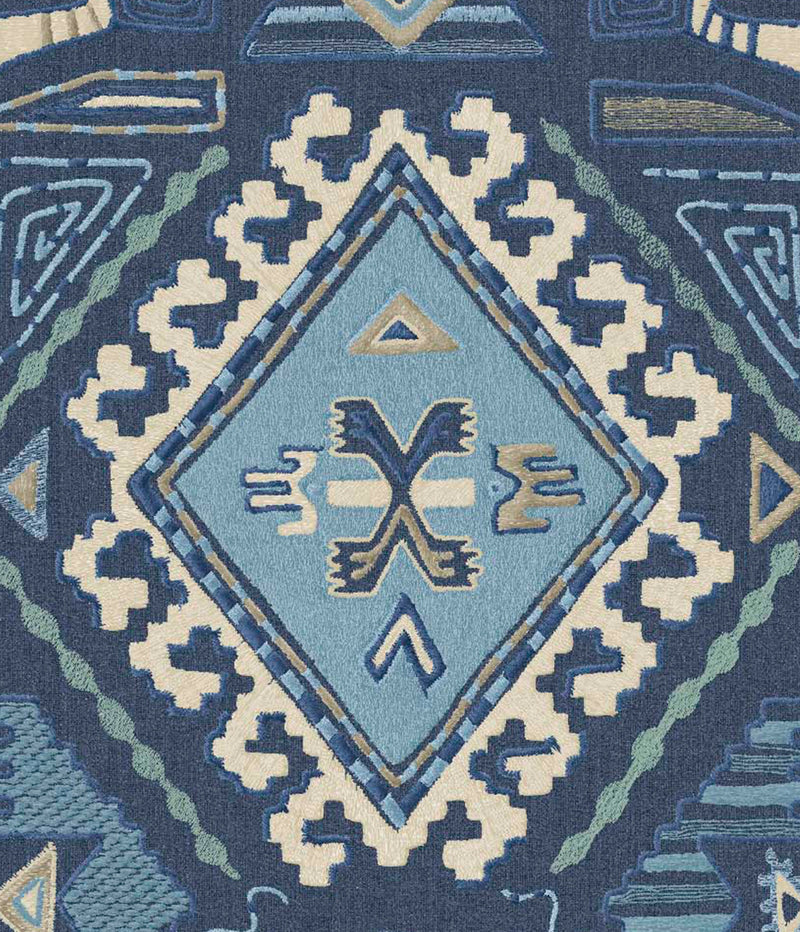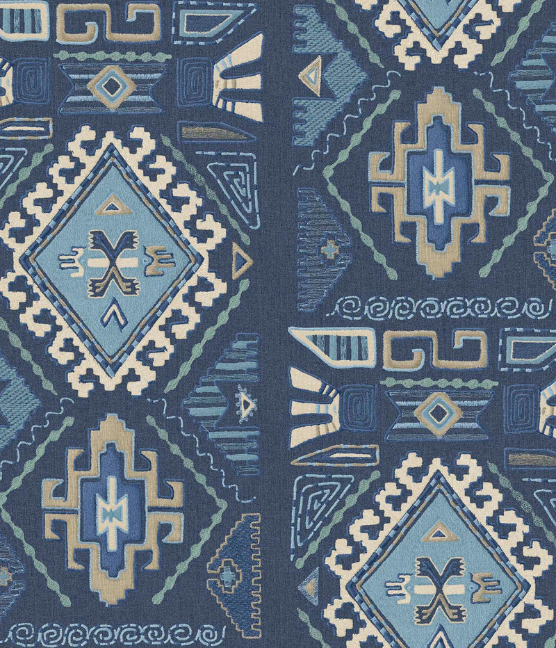 Chakara FR is a striking contract fabric featuring large-scale geometric patterns inspired by traditional Andean design. The bold, symmetrical print creates a tapestry-like effect that adds structure and visual interest to any space.