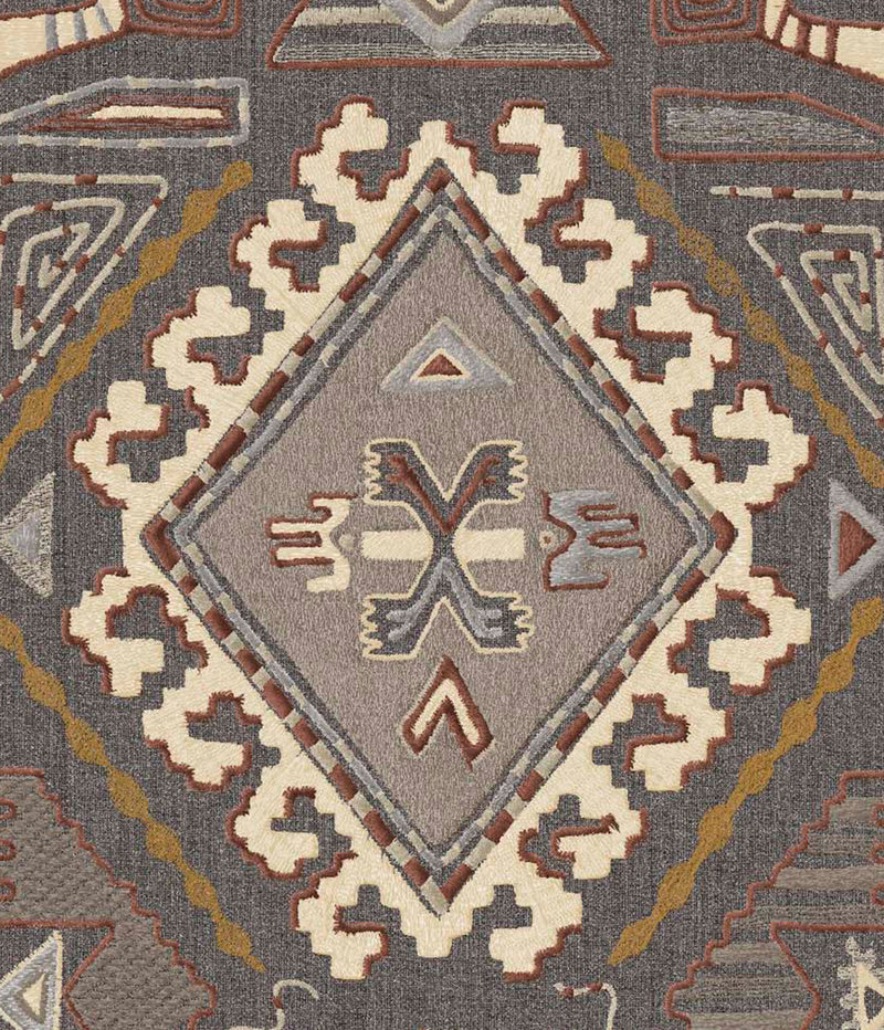 A bold printed fabric with large-scale geometric motifs and folkloric influence. Inherently fire retardant and ideal for curtains, blinds and cushions.