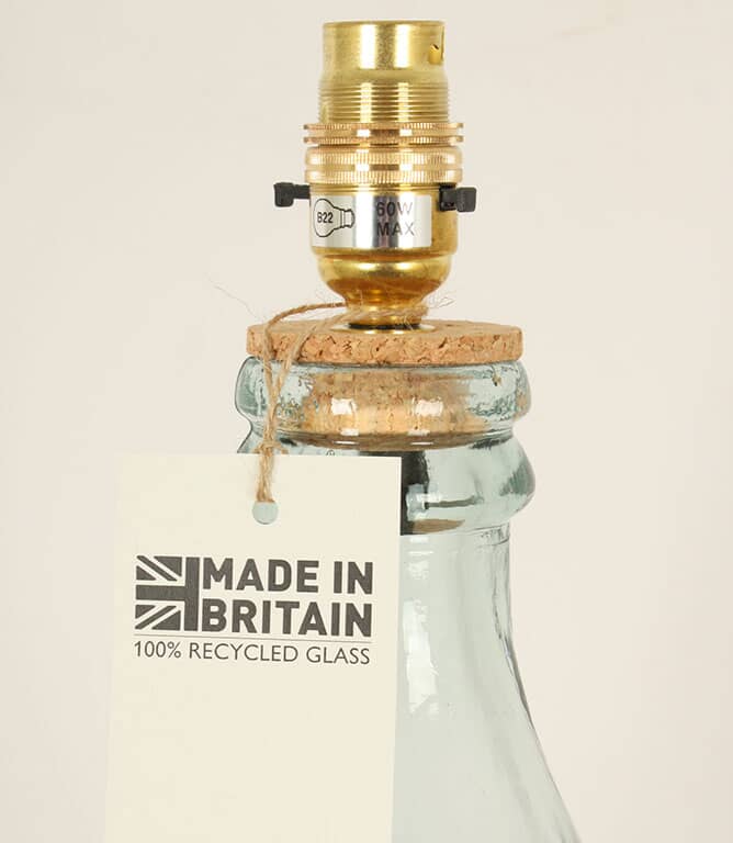 The recycled glass is made in Spain, cork is from Portugal and all lamp fittings are made in the UK.