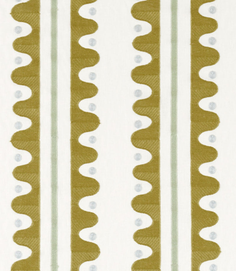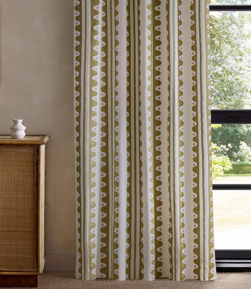 Woven from a cotton-rich blend, it holds its structure while still draping elegantly. As full-length curtains, the embroidered stripes fall in confident, rhythmic lines, adding colour and texture to a room. Roman blinds feel architectural and bold, while cushions allow the stitch detail to shine - especially when piped in a contrasting trim.