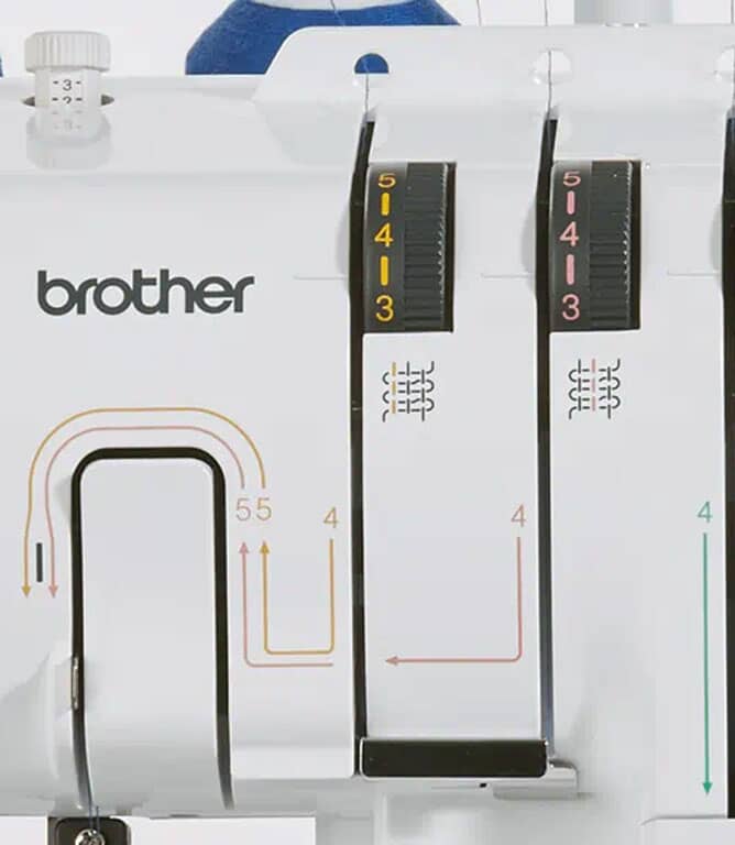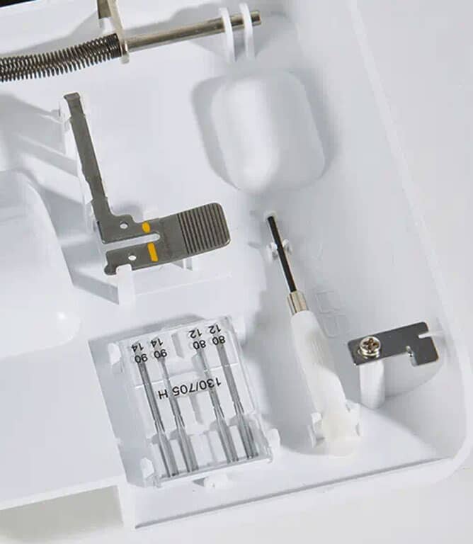 - Accessories included: Blind stitch foot. Piping foot. Gathering Foot. Pack of needles. Cleaning brush. Hexagonal drive. Thread guides. Thread nets. Tweezers. Dust cover. Foot control. Tutorial DVD. Operational manual. Soft cover. Accessory bag.