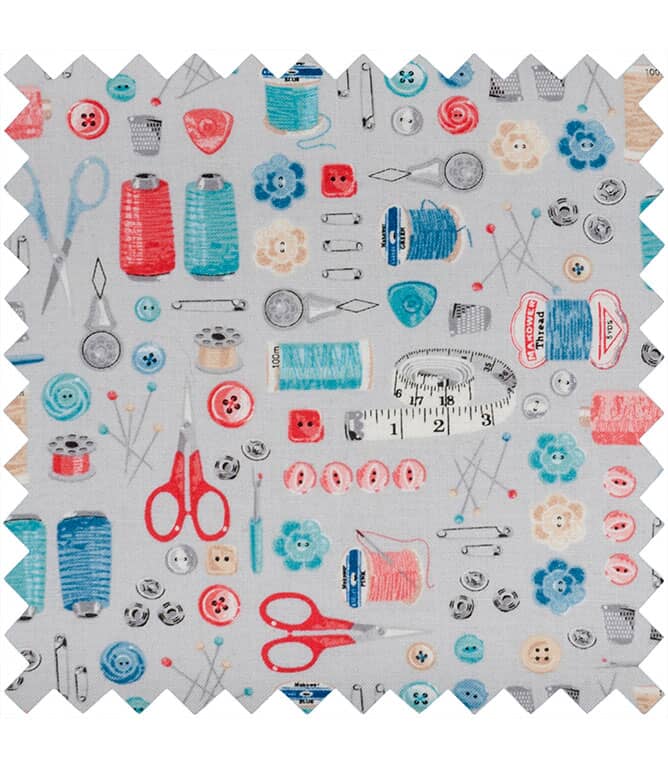A novelty pincushion in the shape of an iron with a lovely button and thread print design
