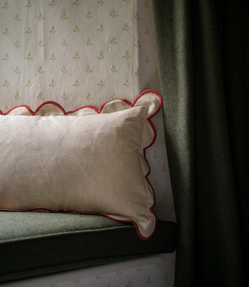 The Scallop Cushion is an effortlessly elegant piece that introduces gentle structure and thoughtful detailing to an interior. Its softly curved scalloped edge, finished with a contrasting trim, creates a decorative silhouette that feels both timeless and quietly distinctive. The natural linen-look fabric adds warmth and subtle texture, making it perfectly suited to country homes, relaxed contemporary spaces or layered traditional schemes.
