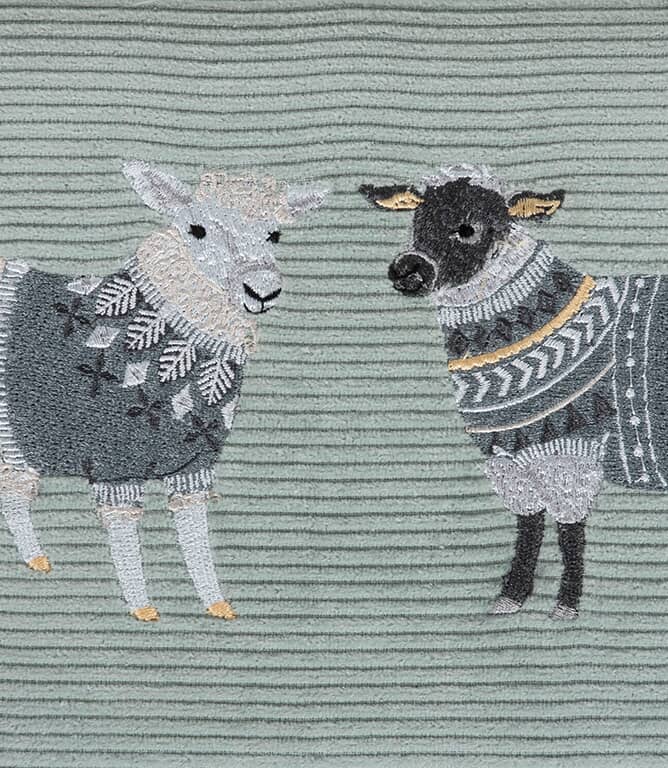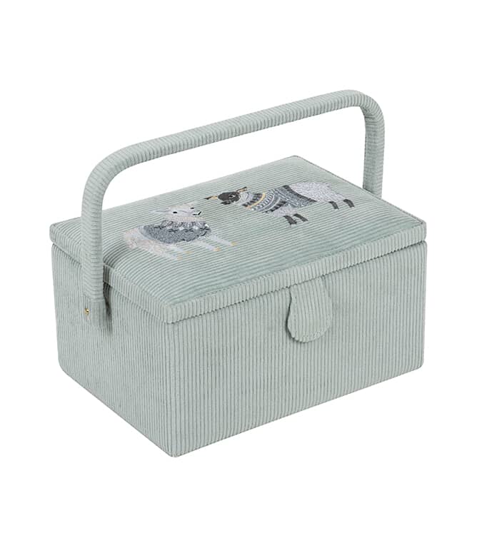 A charming embroidered sewing box in soft corduroy, featuring cosy sheep in woolly jumpers - practical, playful and perfect for gifting.