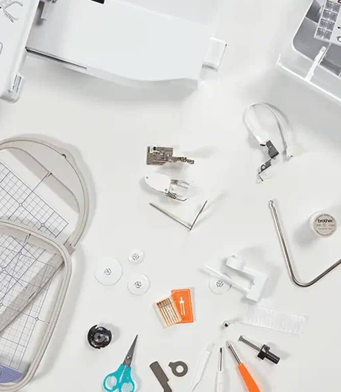 - Accessories included: Zigzag foot “J” (on machine), Monogramming foot “N”, Overcasting foot “G”, Zipper foot “I”, Buttonhole foot “A”, Blind stitch foot “R”, Button fitting foot “M”, Embroidery foot with LED pointer “U+”, Open toe foot, Free motion open toe quilting foot “O”, Non stick foot, Stitch guide foot “P”, Adjustable zipper/piping foot, Walking foot 1/4" piecing foot, Side cutter “S”, Quilting guide, Needle set, Twin needle, Bobbin (4) (One bobbin is on machine.), Seam ripper, Scissors, Cleaning brush, Eyelet punch Set of screwdrivers, Horizontal spool pin, Spool cap (large), Spool cap (medium) (2) (One spool cap is on machine.), Spool cap (small), Thread spool insert (mini king thread spool), Spool net, Knee lifter, Alternate bobbin case (no color on the screw) Standard bobbin case (green marking on the screw) (on machine), Foot controller Embroidery hoop and sheet 260 x 160 mm, Embroidery hoop and sheet 180 x 130 mm, Embroidery bobbin thread (60 weight, white), Accessory bag, Dust cover, Grid sheet set, Operation Manual, Quick Reference Guide, Embroidery Design Guide