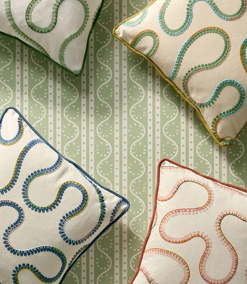 Printed on a beautiful cotton-linen blend, it drapes effortlessly for full-length curtains where the vertical rhythm enhances height and movement. Roman blinds give the stripe a tailored sharpness, while cushions offer an easy way to introduce its graphic charm. For upholstery, it works wonderfully on occasional chairs, benches or headboards, adding personality without overwhelming a space.