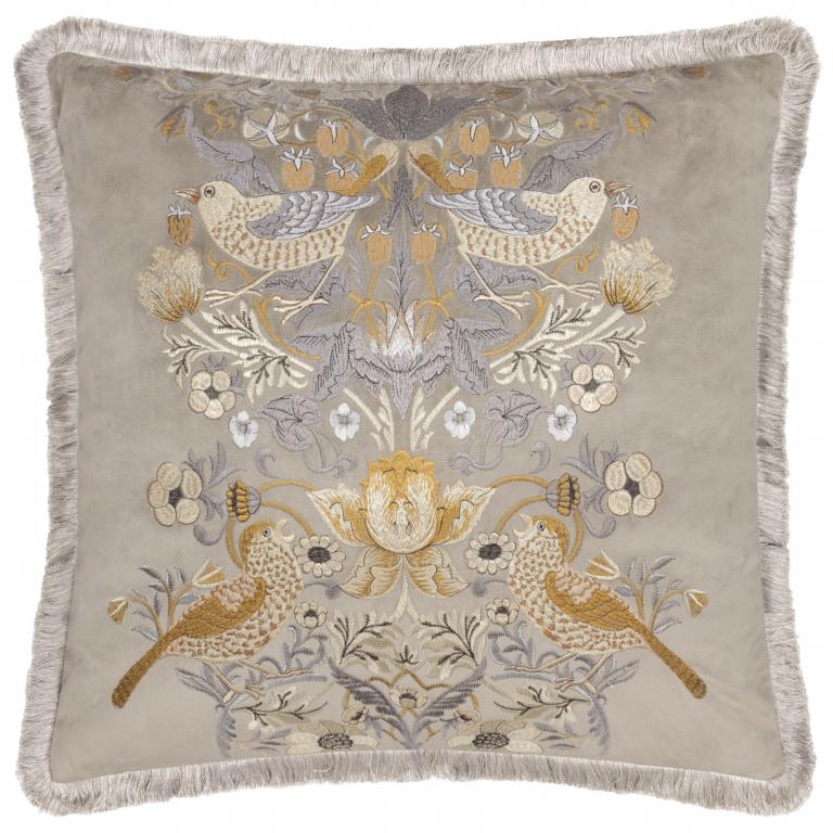 This beautiful cushion is a soft matt velvet with intricate embroidery of the classic Strawberry Thief design. Layer onto a sofa for a welcoming and cosy look or add to a bed for a touch of luxury. The cushion has a lovely thick cotton fringe trim, velvet reverse and feather inner.