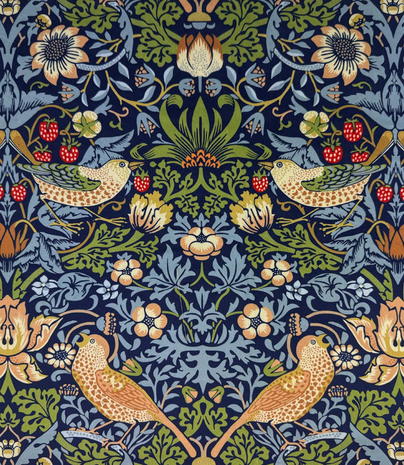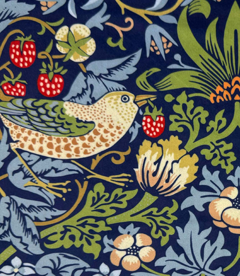 Suitable for both curtains and upholstery, this velvet fabric is based on the timeless William Morris design and features birds amongst strawberries and foliage.