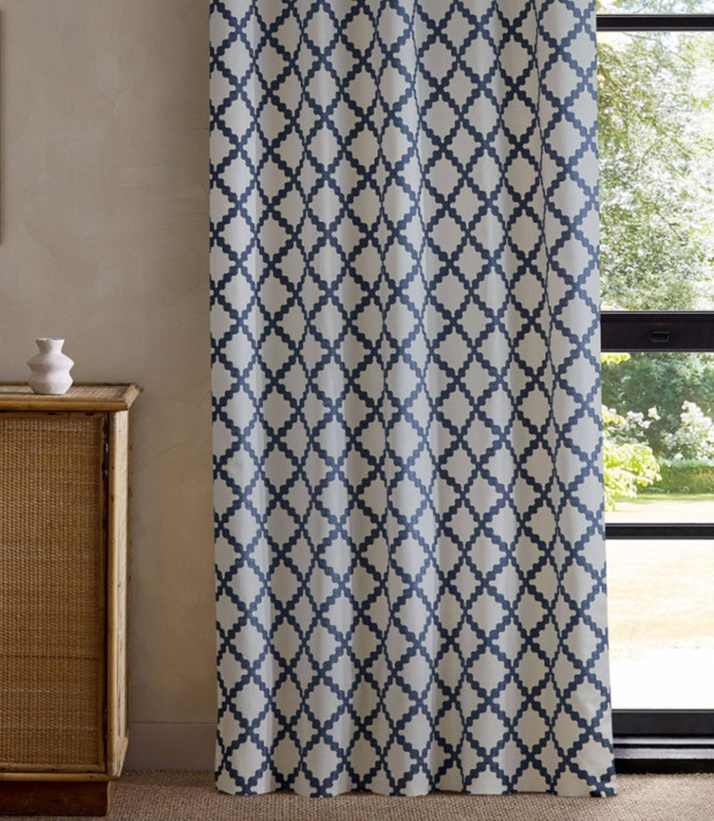 Woven on a cotton-rich blend, it has enough structure to hold its shape beautifully. As curtains, the embroidered trellis falls in confident, repeating lines, adding pattern without overpowering a space. Roman blinds feel tailored and graphic, while cushions allow the raised detailing to shine - especially when finished with contrasting piping.