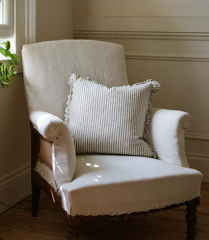 A timeless ticking stripe cushion crafted from 100% French flax linen and finished with a soft ruffled edge for relaxed country elegance.