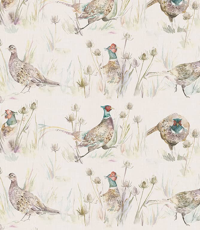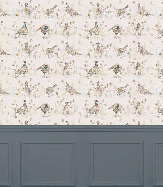 A wide-width wallpaper sold by the metre featuring painterly pheasants in soft watercolours, perfect for adding countryside charm to your home.