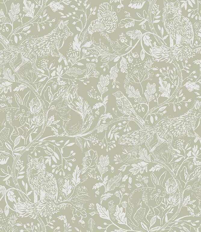 Cademuir Sage Wallpaper by Voyage Maison is a beautifully detailed wallpaper featuring a hand-drawn woodland scene of foxes, owls, squirrels, and hares nestled amongst leaves and acorns. The intricate white linework set against soft, muted backgrounds creates a sophisticated design that works equally well in classic country cottages or contemporary homes.