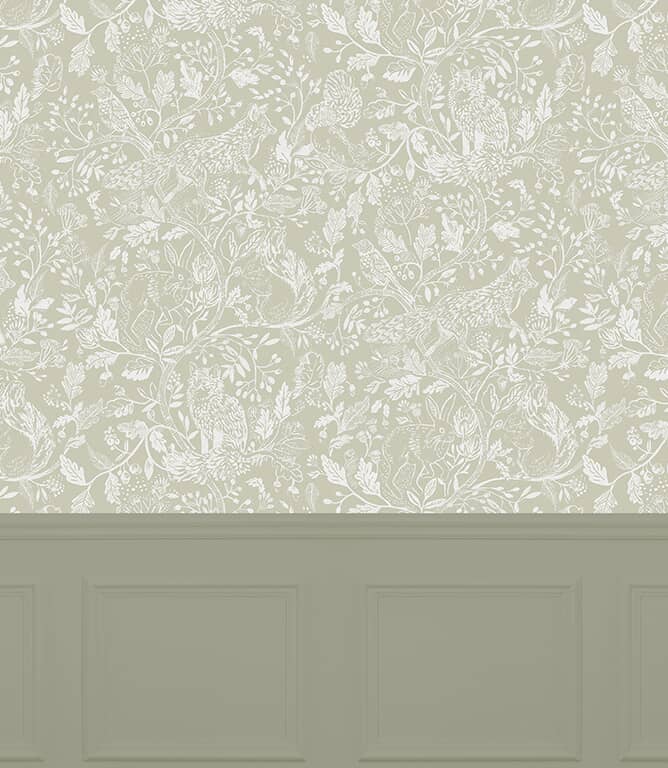 A wide-width wallpaper sold by the metre with intricate woodland motifs, ideal for creating a timeless and elegant feature wall.