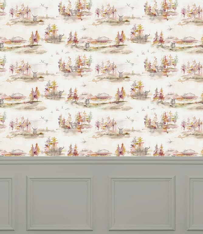 Caledonian Forest Plum Wallpaper by Voyage Maison captures the wild beauty of Scotland’s ancient landscapes. This enchanting wallpaper showcases painterly scenes of deer wandering through woodlands and rolling hills, depicted in soft watercolour tones. Evoking a sense of calm and natural elegance, it brings the spirit of the Highlands into your home, making it an ideal choice for living rooms, dining areas, or feature walls.