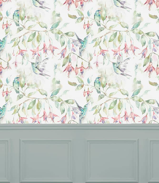 A wide-width wallpaper sold by the metre with painterly hummingbirds and fuchsia flowers, perfect for light, nature-inspired interiors.