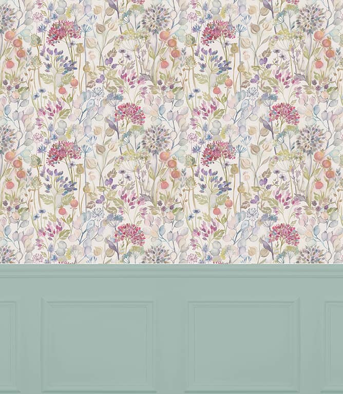 A wide-width wallpaper sold by the metre showcasing a medley of wildflowers and foliage in a painterly watercolour style.